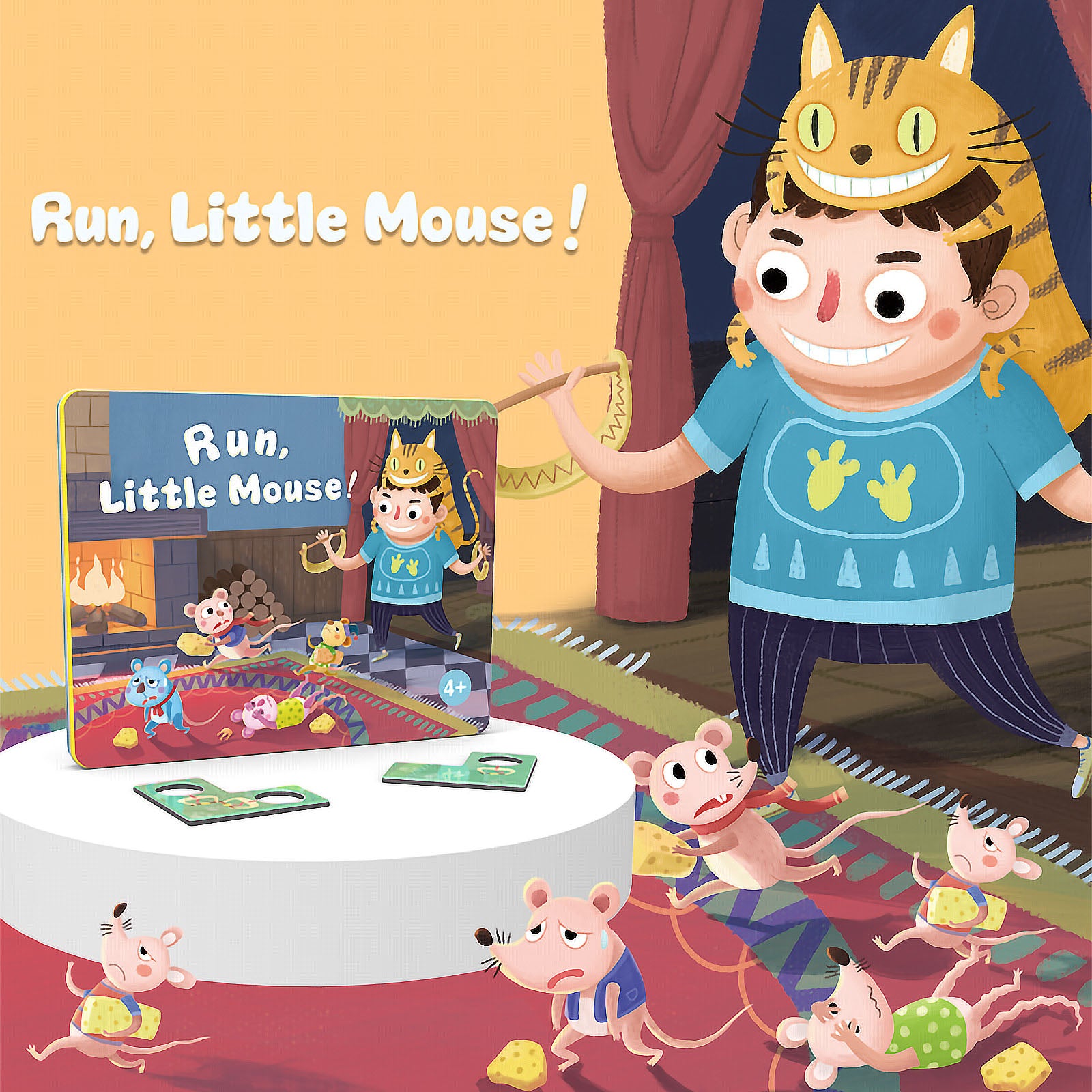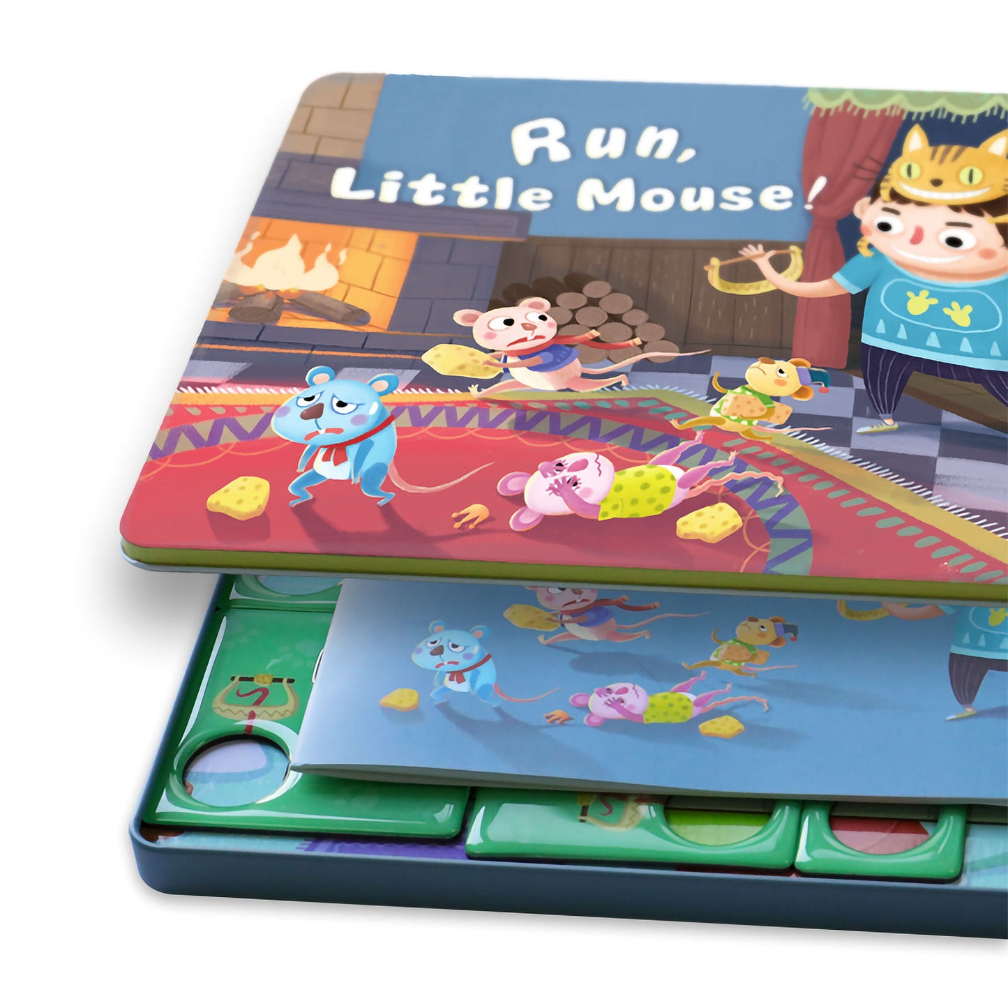 *Game rule: The game contains 15 game boards and 7 mousetrap magnets.By observing the locations of mouses on thegame boards and the directions of their tails, children put the 7 mousetrap magnets onto the right places on the game boards to make sure that the mouses are caught.