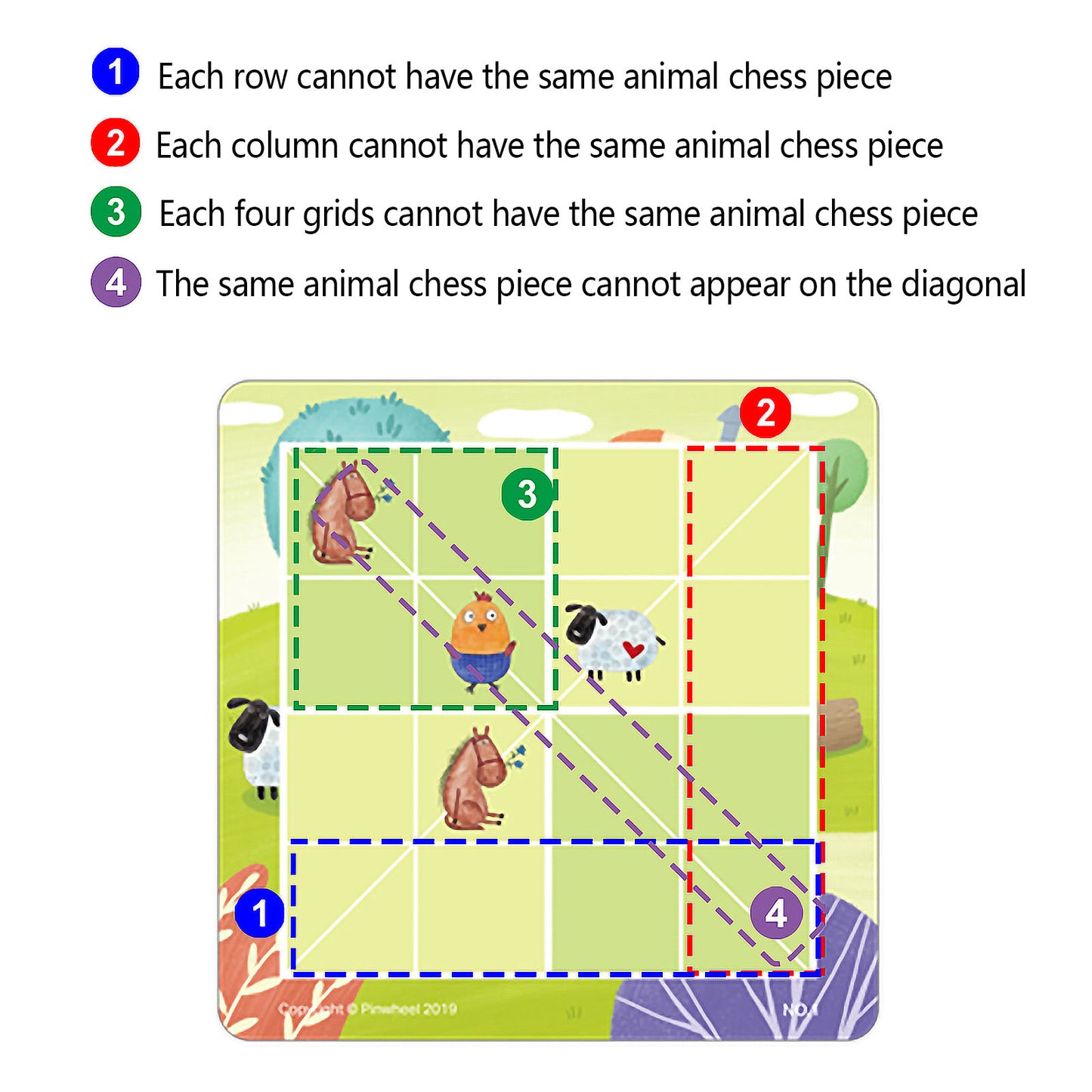 *A total of 15 game cards (double-sided question cards), 1 game manual and 16 game pieces are included. Players need to infer all the animals with the remaining blanks based on the known animals on the 4x4 board, And satisfy that each row and each column cannot have the same animal chess piece, and each color area cannot have the same animal chess piece.